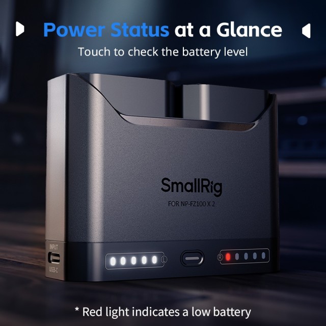Each charging channel features five LED indicators that display power levels in 20% increments, even without external power. A red warning light activates when battery levels are critically low. Additionally, the charger incorporates a universal USB-C input port and comes with a fast-charging cable, making it compatible with wall adapters, car chargers, and power banks for versatile charging options.