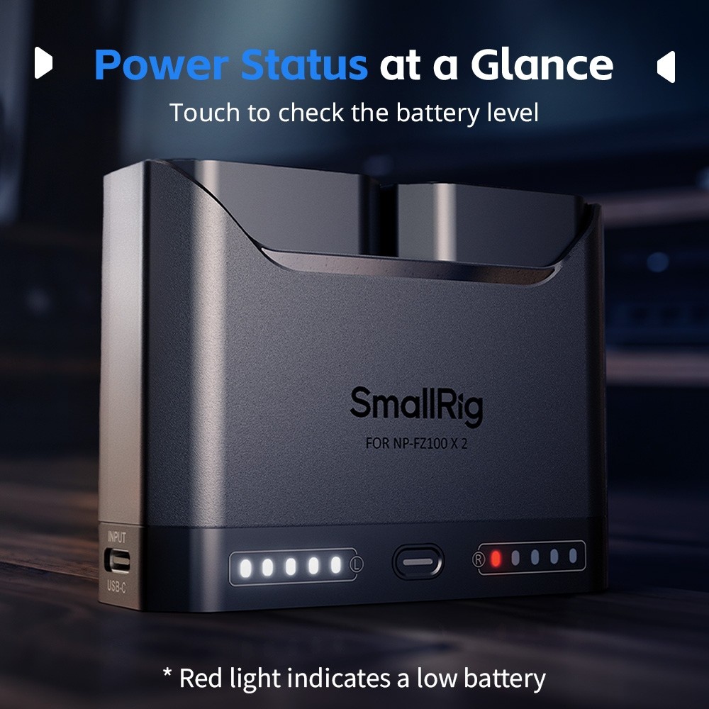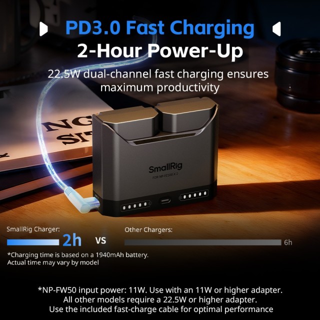 SmallRig Turbo Charging Kit for NP-FW50 Camera Batteries 5488 includes two batteries and a dual-channel fast charger. Featuring a full decoding chip, this kit ensures full compatibility with Sony NP-FW50 batteries, eliminating pop-up warnings while supporting in-camera power display and original charger use.