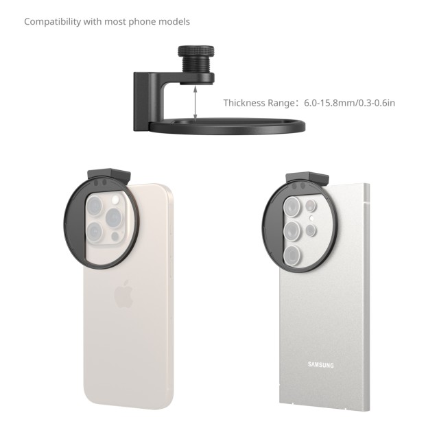Featuring a magnetic attachment, the adapter enables seamless filter installation and replacement. A locking knob securely fastens the filter to the phone for enhanced stability, while anti-scratch padding on both sides protects the phone. The clamp opening range is 6-15.8mm / 0.24-0.62in, ensuring compatibility with various phone models, although it is recommended to use it without a phone case. Additionally, it comes with a threaded adapter for universal compatibility with 67mm threaded filters.