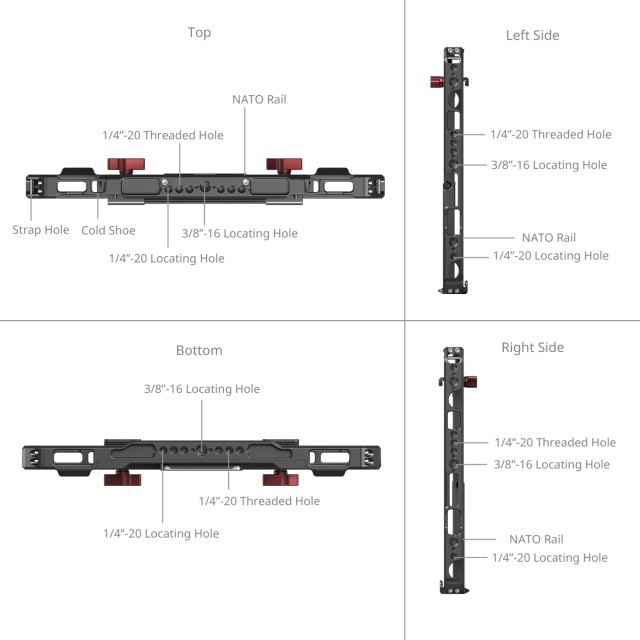 6. Built-in 1/4"-20 and 3/8"-16 locating holes, a strap slot, cold shoe mount, and NATO rail, allowing you to mount such as NPF adapters, power bank holders, SSD mounts, handles,.etc.