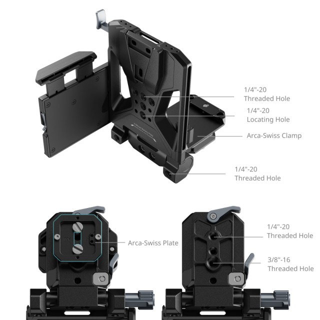Additionally, the detachable Arca-Swiss quick release plate facilitates quick transitions between handheld and tripod modes. Once removed, it reveals 1/4"-20 and 3/8"-16 threaded holes for alternative mounting solutions. The V-mount plate is equipped with multiple 1/4"-20 threaded and 1/4"-20 locating holes, allowing for the attachment of accessories such as magic arms (ID 3238B / 3873) for wireless transmitters and professional setups.