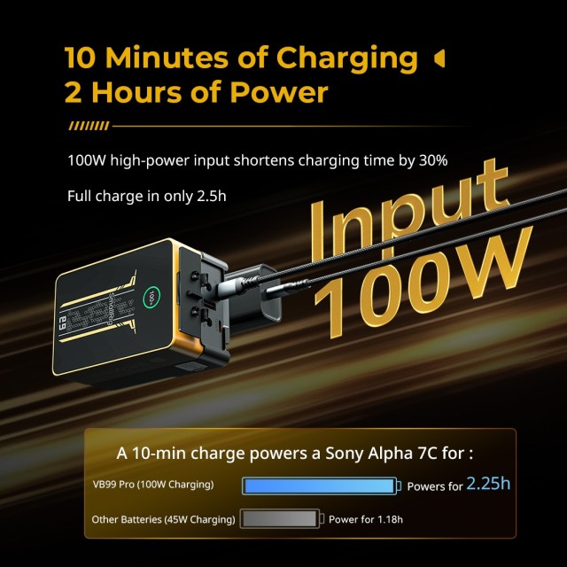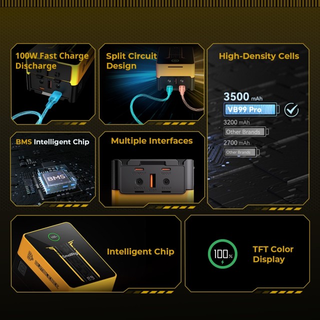 SmallRig VB99 Pro Power Bank (BumbleBee Edition) 5527 is about 70% the size of a normal V-mount battery, given its highly integrated design which takes up less space, making it lighter and more portable! The highly integrated (fast charging protocol chip + MCU + voltage boost control) BMS chip supports a wide range of mainstream fast charging protocols (PD / QC / PPS etc.), bi-directional 100W (Max.) USB-C PD fast charging, as well as adaptive voltage boost/ adaptive current regulation, etc.! In addition, its customized intelligent BMS system ensures faster and safer charging by providing multiple protections against over-current / short-circuit / over-temperature / over-voltage, etc. Such interfaces as D-tap / USB-C / USB-A / 8V-OUT / 12V-OUT / BP electrode are also included for efficient charging/powering of camera/camcorder/monitor / wireless video transmitter / LED video light / mobile phone/laptop etc., without using a V-mount plate to convert! The BMS chip has a 16-bit ADC / power meter algorithm, together with an MCU and a TFT digital display for you to keep track of the battery's status at all times. Built-in premium high-performance battery (no inflated capacity), which is rechargeable and stable, and meets MSDS / UN38.3 / IEC62133 / UL2054 / UL62368 and other internationally recognized standards. Its shell is made of sturdy, drop-proof aluminum alloy and fireproof PC and features a durable, scratch-resistant PC and acrylic cover on the front, with a TFT color screen displaying battery status clearly and accurately. Overall, this item is safe and powerful enough for you to capture every moment without burden!