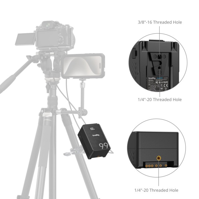 SmallRig VB99 SE mini V Mount Battery 4608 is a compact V-mount battery featuring a highly integrated design that effectively reduces the battery's overall size, making it lightweight and portable. It features LG A-grade 18650 high-rate cells, ensuring accurate capacity, cycle performance, and exceptional stability. Designed to meet international standards such as MSDS / UN38.3 / IEC 62133 / UL2054 / UL 62368, it has obtained certifications including FCC / CE / RoHS / ISED / RCM / PSE / KC, ensuring safe and reliable operation for users. The battery is equipped with a BP, a D-Tap, an 8V-OUT DC, a 12V-OUT DC, a USB-C, and USB-A ports offering a wide range of interfaces for powering multiple devices simultaneously. This includes cameras, mirrorless cameras, monitors, transmitters, video lights, smartphones, tablets, laptops, and more, providing integrated and efficient power supply for all your needs.