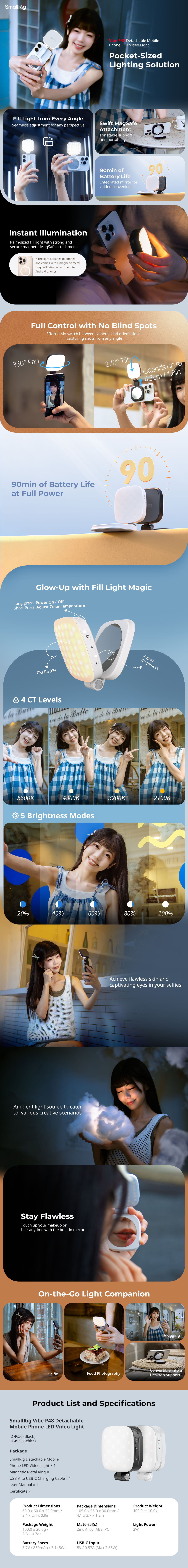 SmallRig Vibe P48 Detachable Mobile Phone LED Video Light (White) 4933 is the first SmallRig detachable MagSafe-compatible fill light. It offers seamless quick attachment and detachment to Apple phones through MagSafe. Alternatively, it can be swiftly installed on Android phones using the included metal ring sticker.