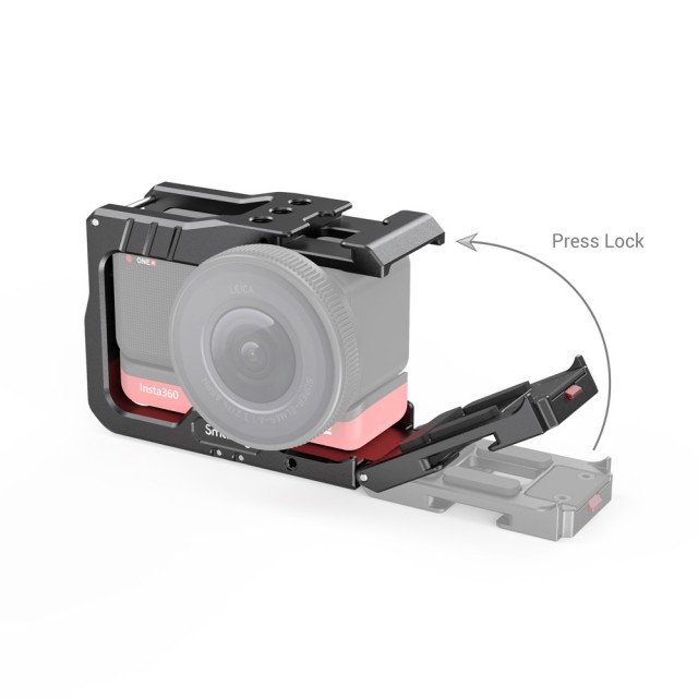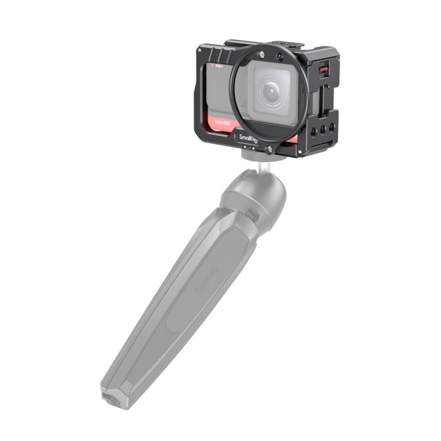 SmallRig Vlogging Cage and 52mm Filter Adapter for Insta360 ONE R 4K Edition 2901 is a form-fitting aluminum cage that protects the camera while providing a plenty of accessory mounts, without interfering with the camera's button or port. Simply slide the camera into the cage from the side, and press the cover to lock it in place. The cage features two cold shoes and several 1/4”-20 threaded holes for accessory mounting, like a microphone or a small LED light. The folding fingers on the bottom let you to attach the camera on a variety of GoPro-type mounts and surfaces; while the 1/4”-20 mount at the center on the bottom makes it possible to attach the camera on a 1/4”-20 tripod. The cage features a filter ring that accepts filters with a 52mm thread, which can be attached both on the front and back of the cage.