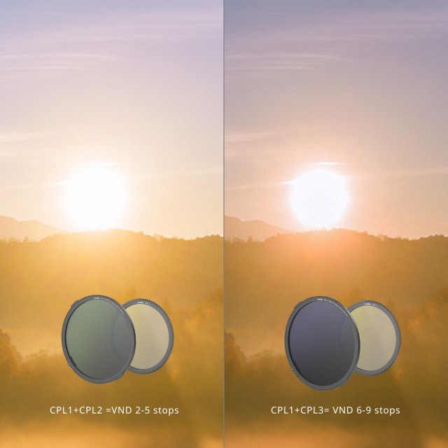 2. When using CPL1 with CPL2, it achieves a VND effect of 2 to 5 stops; when using CPL1 with CPL3, it achieves a VND effect of 6 to 9 stops.