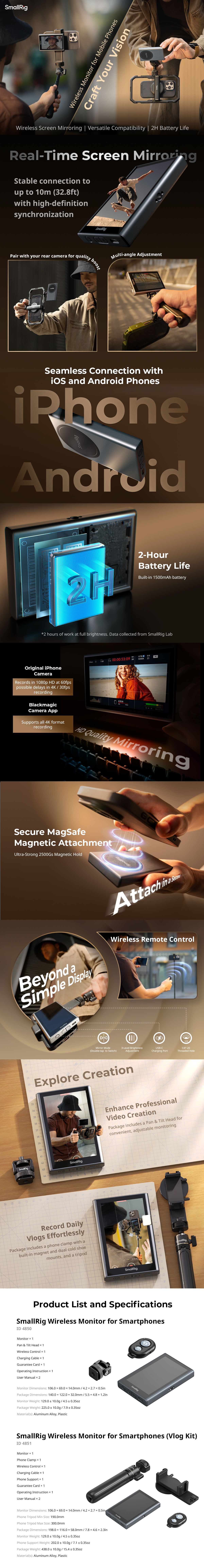 SmallRig Wireless Video Monitor for Phone (Vlog Kit) 4851B offers a screen mirroring solution for mobile content creation. The product features a mobile phone monitor, phone support, wireless remote controller, charging cable, and other accessories. The monitor can be mounted to the phone using the included phone support and other adapter accessories, or magnetically attached to iPhones or phones with magnetic rings, offering versatility. During taking selfies or using the rear camera of the phone, the monitor can display a real-time mirror image of the mobile camera view.