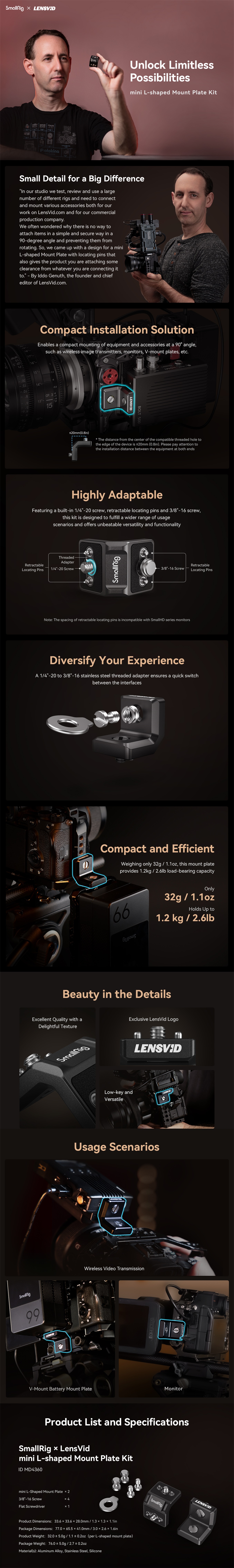 SmallRig x LensVid mini L-Shaped Mount Plate Kit MD4360 is co-designed by Iddo Genuth, co-founder and editor of LensVid.com, a photography and video website that has been in business for 10 years, and SmallRig DreamRig program. This kit provides a more compact solution for mounting equipment and accessories, such as wireless image transmitters, monitors, V-mount…