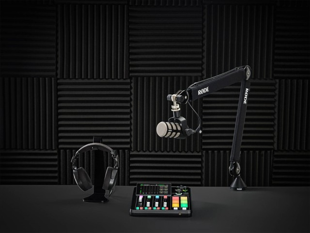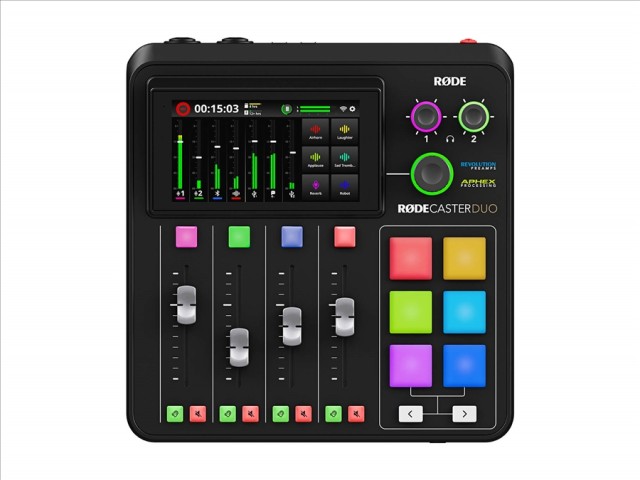 compact studio mixer for podcasting and streaming, 2 analog inputs – microphone/line/instrument, 2x headphone outputs, 1x headset input, output for audio monitors, 2x USB-C, Wi-Fi, Ethernet, Bluetooth®, receiver for RØDE wireless, 4 physical and 3 virtual faders, touchscreen LCD display, APHEX® processors, RØDE FX effects