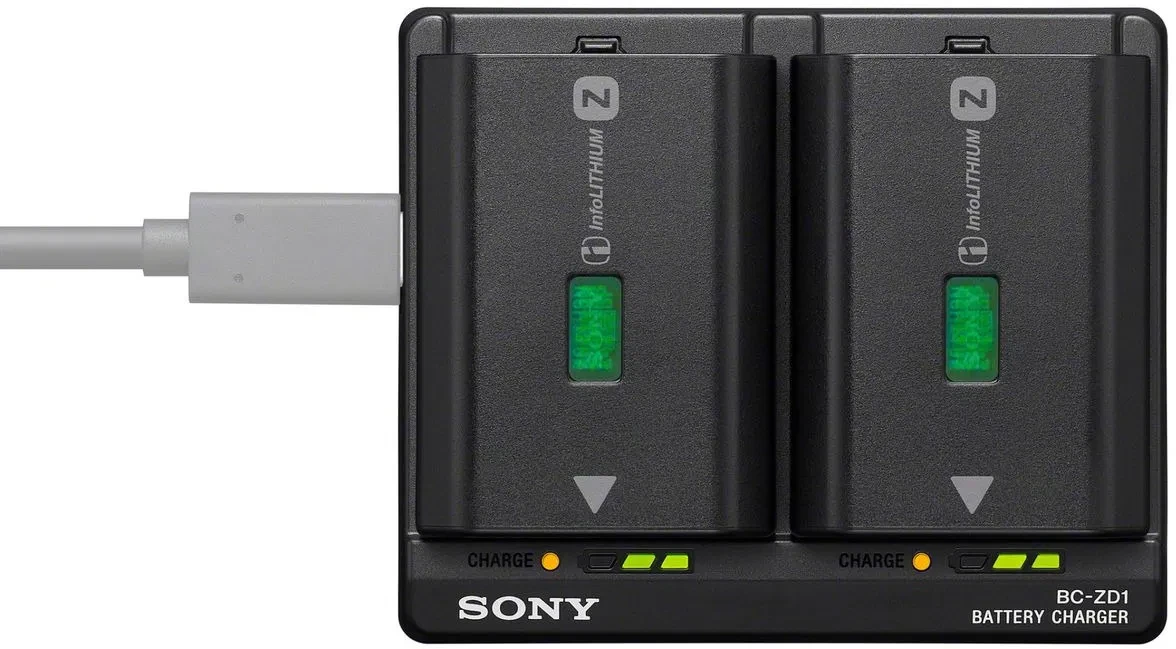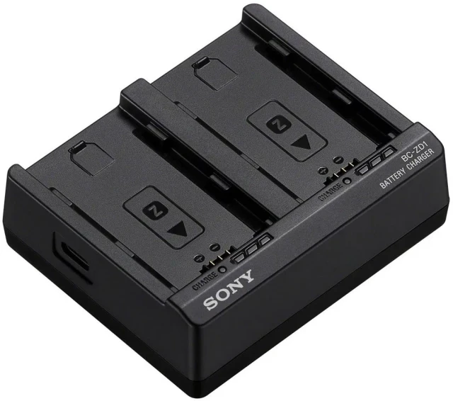 The Sony BCZD1 Battery Charger is a high speed dual charging solution designed for Sony NPFZ100 batteries. This compact and efficient accessory allows you to charge two batteries simultaneously in about 155 minutes when used with a USB Power Delivery compatible source. Its portable design makes it ideal for travel and professional photography. Featuring clear indicator lights and advanced heat management it ensures safe and reliable operation. Keep your camera gear powered and ready for every shoot with this essential Sony charging station built for performance and convenience.