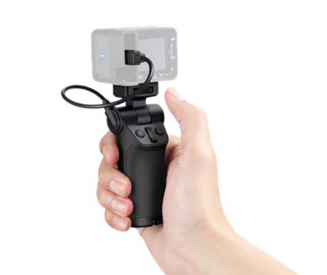 The grip features built-in control buttons for shutter release, video recording, and zoom, allowing for seamless operation without touching the camera body. It connects directly to the camera via a cable and multi-terminal interface, ensuring reliable and responsive control.