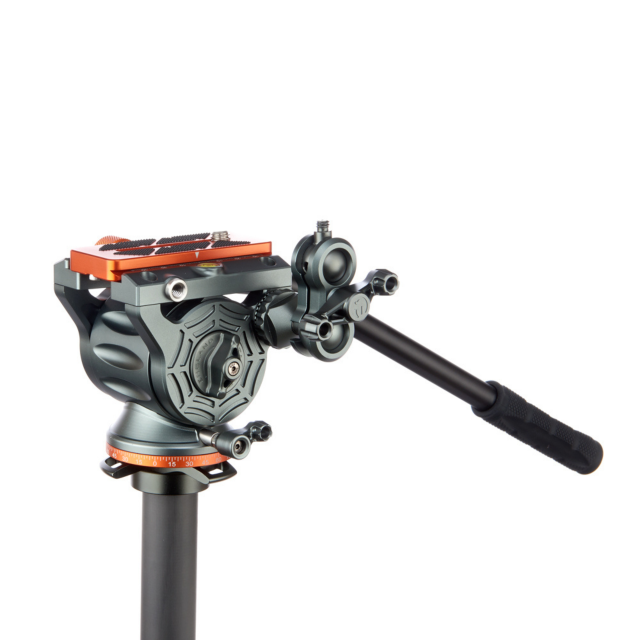 Ball video head with quick release plate, Arca-Swiss clamp, 1/4" and 3/8" threads for camera mounting, suitable for CSC/DSLR cameras, microphones and other devices, adjustable tilting mechanism, base swivels 361°. Grey and orange.