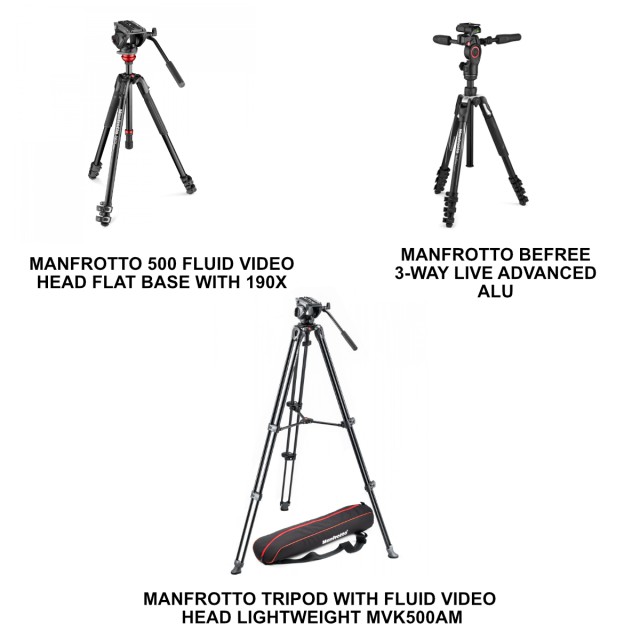 Optional set of lightweight 4Kp60 streaming cameras of your choice HC-X1500 or HC-X2000 or AG-CX10 and PTZ camera Panasonic AW-UE4KG with optional accessories Manfrotto 500 Fluid Video Head Flat Base With 190X or Manfrotto MVK500AM or Manfrotto BeFree 3-Way Live Advance ALU