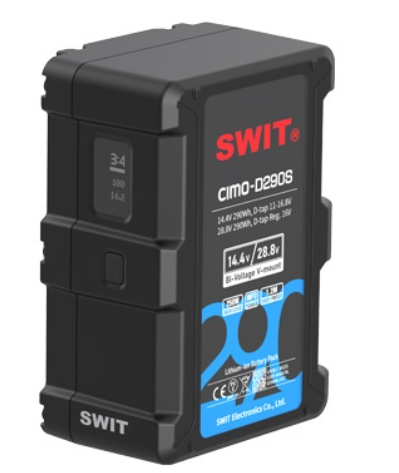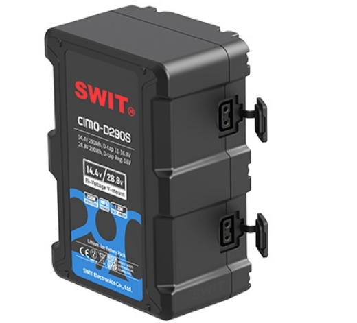 The SWIT CIMO-D290S is a professional 290Wh Bi-voltage V-mount battery with OLED display, supporting both 14.4V and 28.8V outputs for high-power cinema cameras and lighting, with fast charging, dual D-tap outputs, and multiple circuit protections.