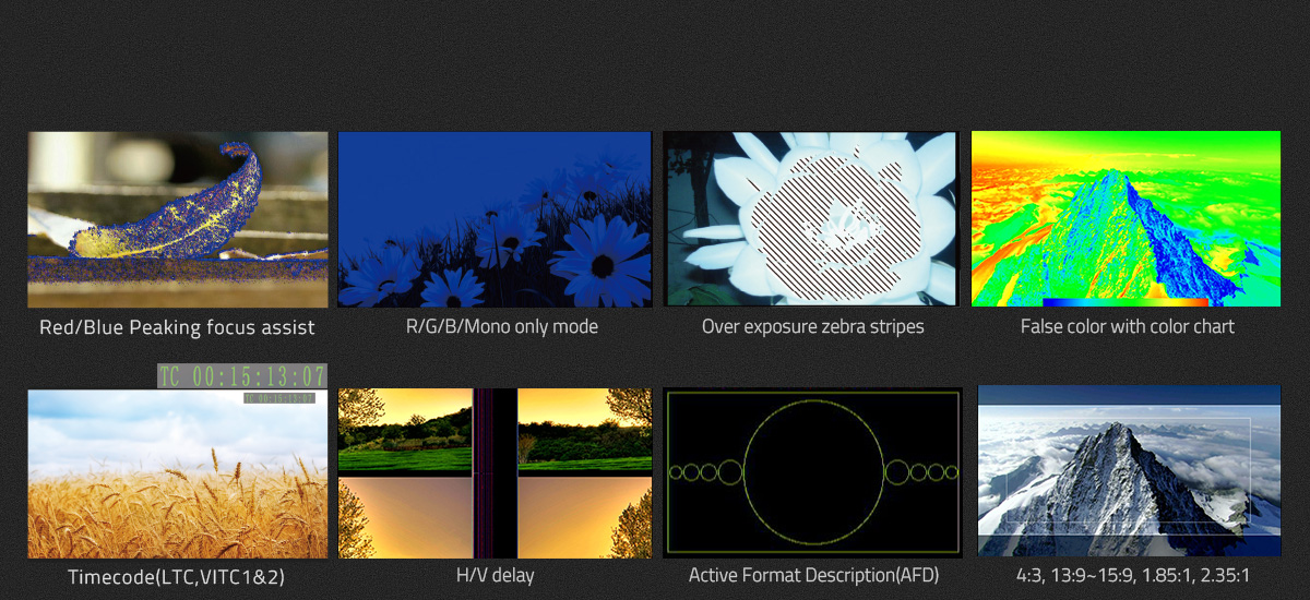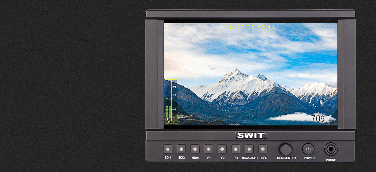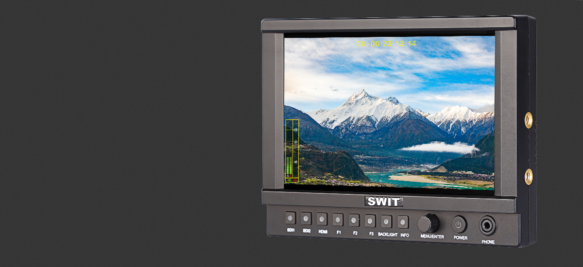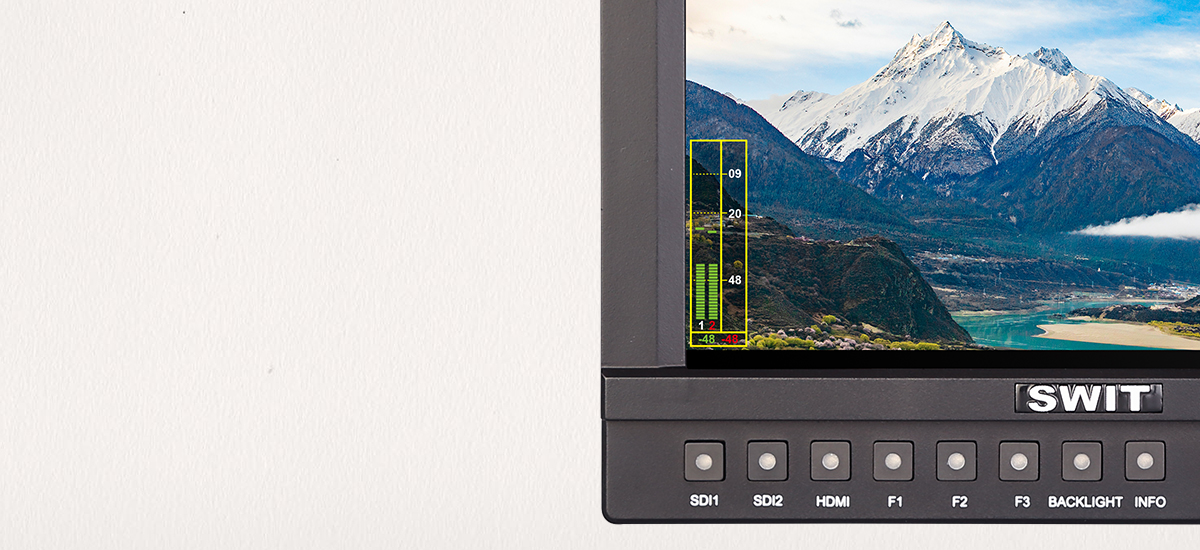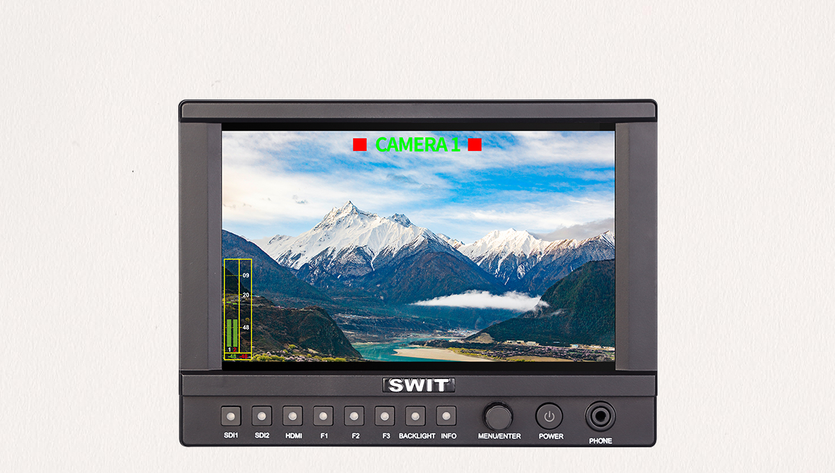 CM-S73H supports SDI-16ch and HDMI®-2ch embedded audio meters display, with marks and audio abnormal alert info. Users can also select any 2 channels audio to output via 3.5mm socket or speakers. The audio meter pattern position can be selected from one of four corners, and you can select to display only 2 channels, 8 channels, and full 16 channels. Also scale markers, alert info, and translucent of the audio meter pattern are selectable.