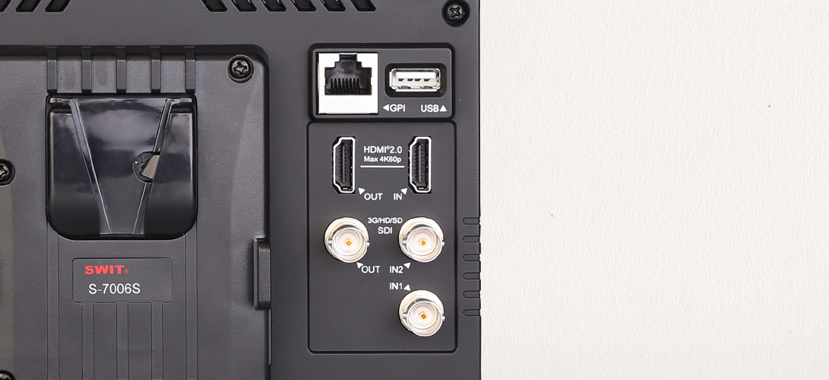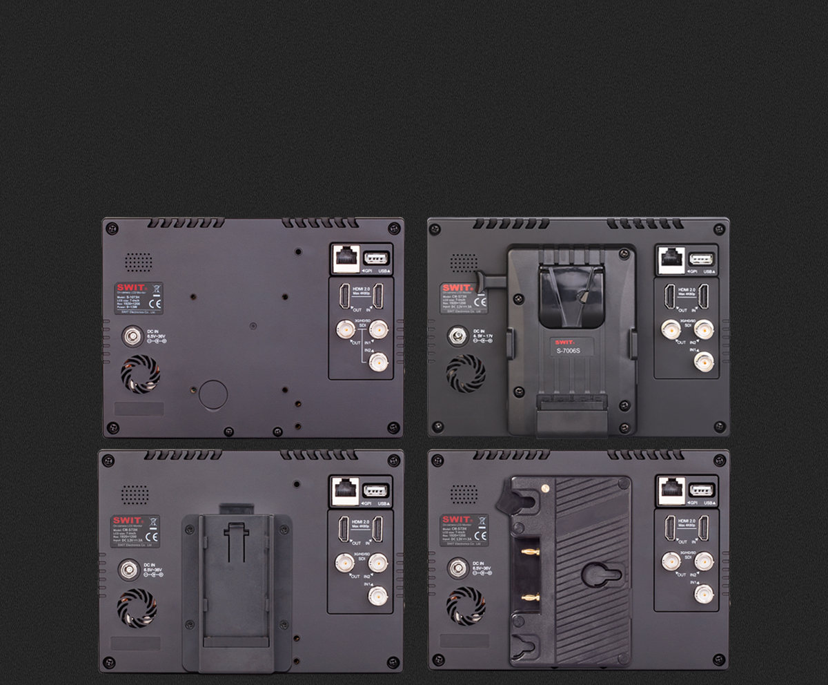 CM-S73H supports DC 6.5-17V input via a 5.5mm lockable DC socket, and can install SWIT S-7006 series V-mount / Gold mount / DV battery plates to power.