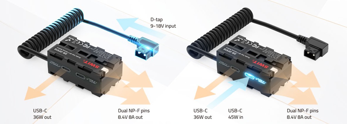 DB-DF570 dummy battery supports D-tap 9-18V power input or USB-C PD 45W input, and converts to dual NP-F pins regulated 8.4V 8A output and USB-C PD 36W output.