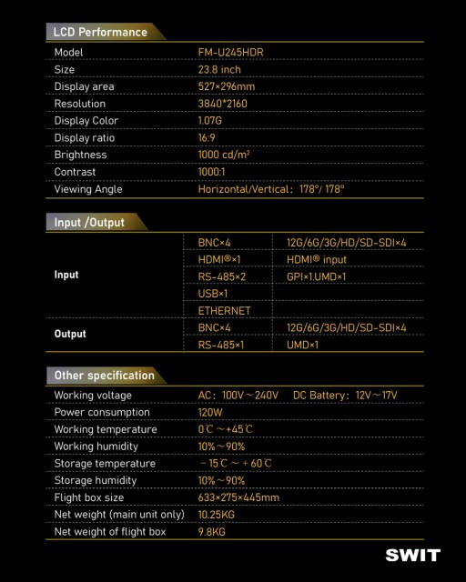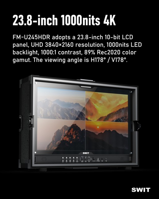 This 23.8” 4K HDR Field Production Monitor is designed for professional use, offering a bright 1000nits display for clear viewing in sunlight. It features extensive video interfaces including Quad 12GSDI…