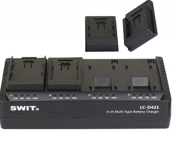 The SWIT LC-D421I KIT is a 4-channel DV battery charger with 4 JVC SSL-style snap-on plates, capable of simultaneously charging four batteries at 2A per channel. Interchangeable plates allow charging of mixed DV battery types with real-time LED indicators for each channel.