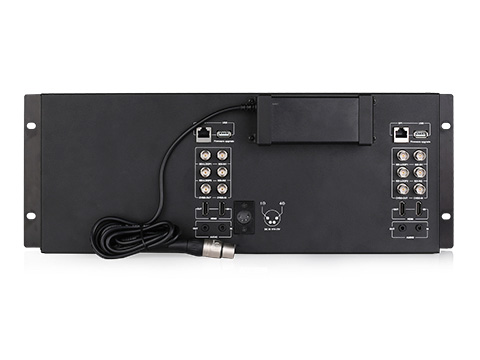 M-1093H provides a 4-pin XLR socket of DC 6.5-24V power input, for the both 2 screens, and an AC-DC adaptor is attached on the rear panel of the monitor.
