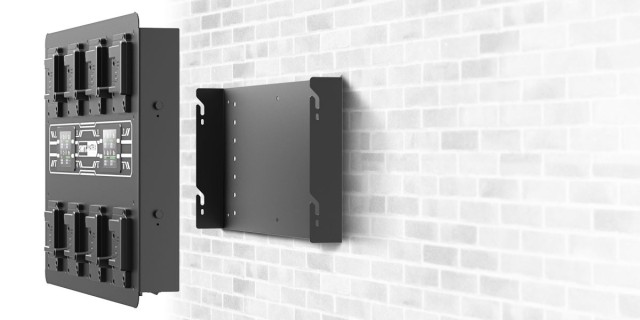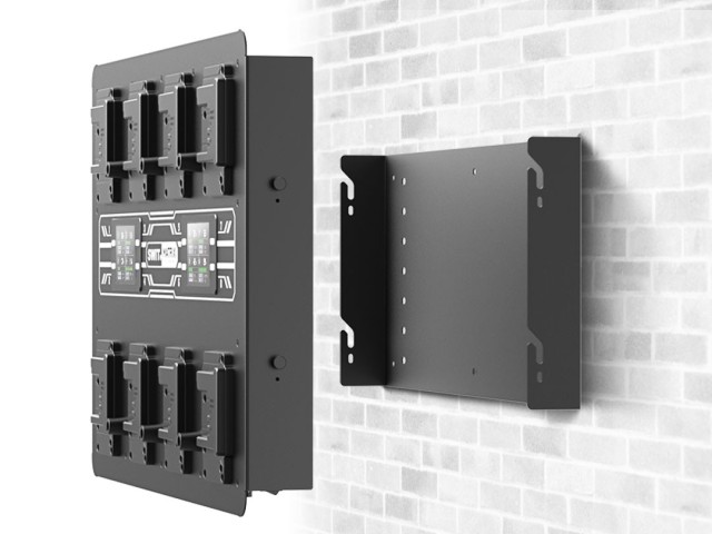 The charger’s design emphasizes both performance and practical installation. It comes equipped with a wall mounting plate for secure attachment to a vertical surface, as well as compatibility with 19-inch rack brackets, enabling flexible integration into broadcast or production setups.
