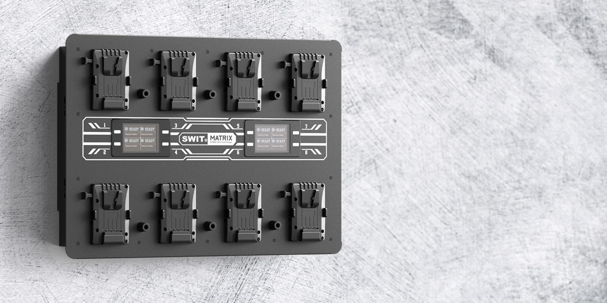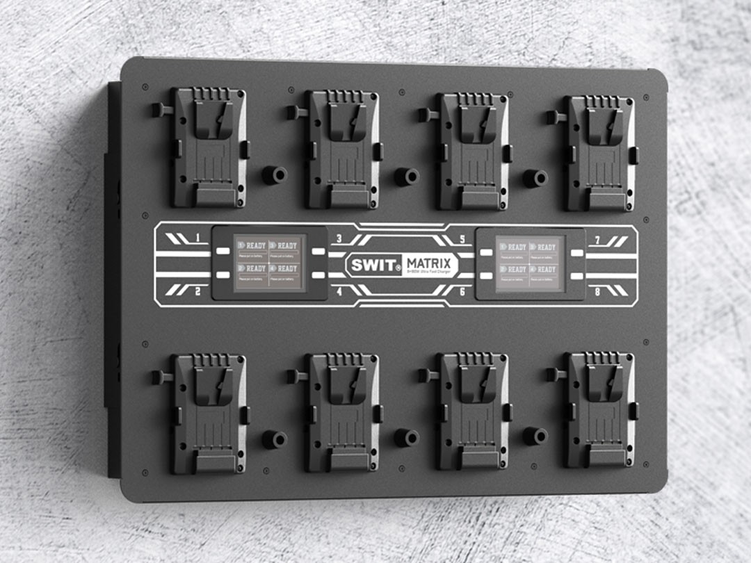 The SWIT MATRIX-S8 is a professional-grade, 8-channel simultaneous V-mount wall charger designed for broadcast television stations, rental houses, and production facilities requiring high-capacity battery charging solutions. This ultra-fast charger delivers 100W per channel and supports both 14.4V and 28.8V V-mount battery formats, making it an ideal choice for operations managing diverse battery inventories. The unit is engineered to significantly reduce charging time while maintaining battery health through intelligent power management.