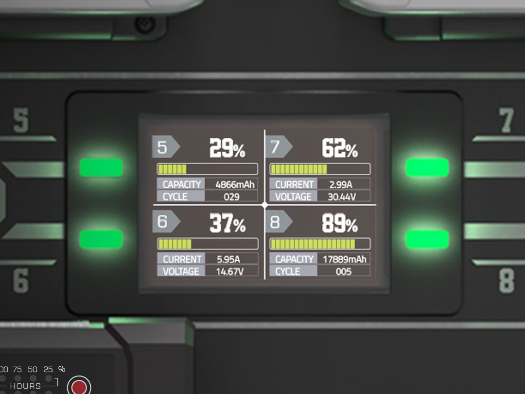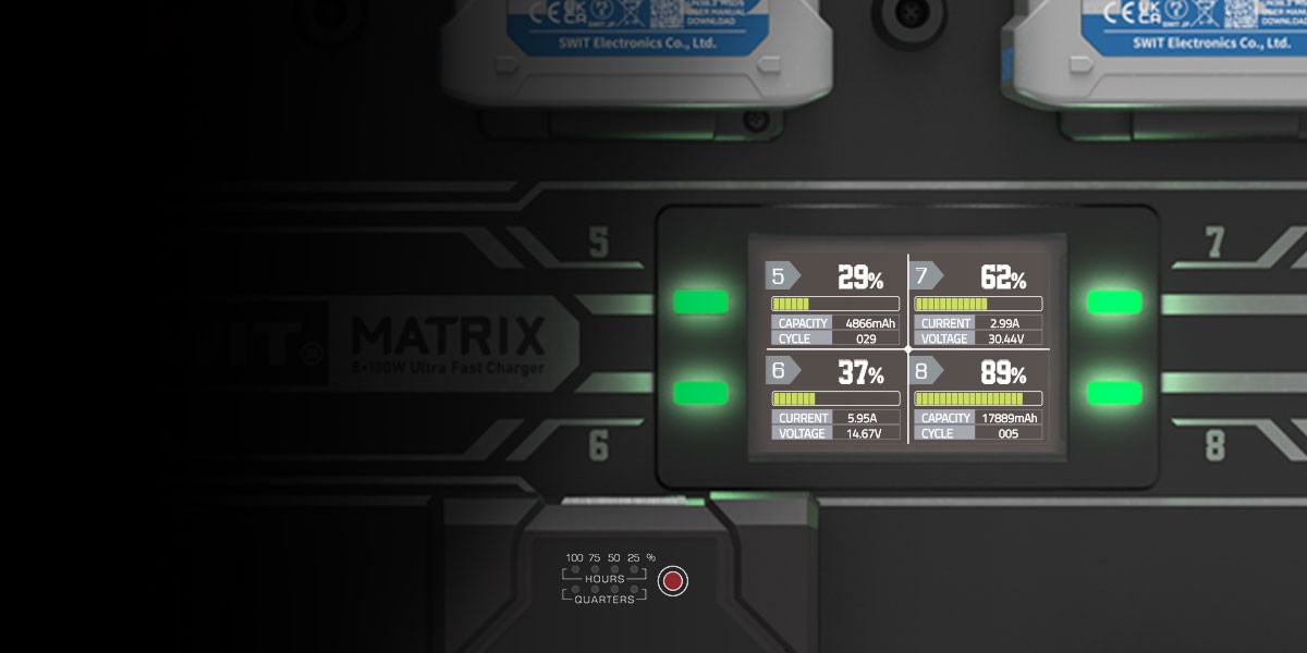 The MATRIX-S8 features dual 3.5-inch color LCD displays that provide real-time monitoring of each charging channel. These displays show charging progress, charging current, output voltage, and battery cycle count information for continuous system transparency. Large LED charging indicators supplement the LCD displays, allowing operators to quickly assess charging status from a distance without approaching the unit directly, facilitating efficient management in busy production facilities.