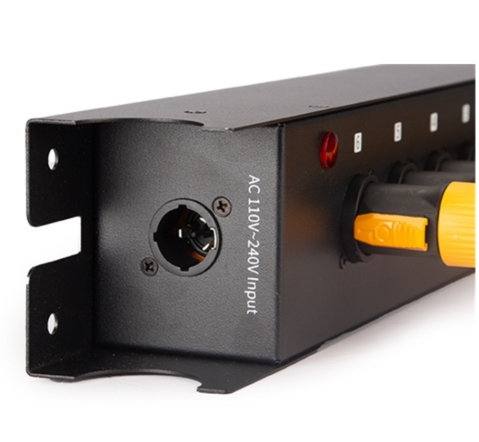 The SWIT PA-J416 is a robust 1-to-4 power distribution box designed for safe, reliable lighting power management in studios and broadcast environments, featuring a 20A max current capacity, self-locking aviation plugs, and a durable cast iron housing.
