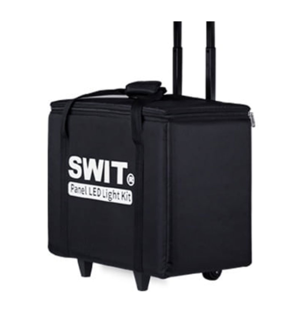 The Swit PL-E90L 3Case is a durable transport trolley bag designed to hold and protect up to three PL-E90L LED lights. Equipped with wheels and a retractable handle, it offers convenient mobility for professional lighting setups.