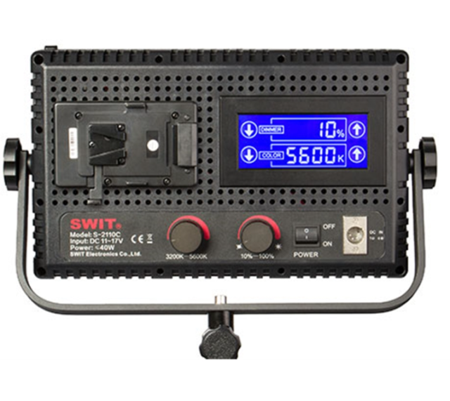 The SWIT S-2110CS is a compact 40W bi-color LED panel light delivering up to 1600 Lux at 1 meter, with smooth color temperature adjustment from 3200K to 5600K. Featuring 576 ultra-bright LEDs, flicker-free dimming, and an LCD touch screen, it is ideal for interviews, studio, ENG, and mobile production setups. Supports V-mount…