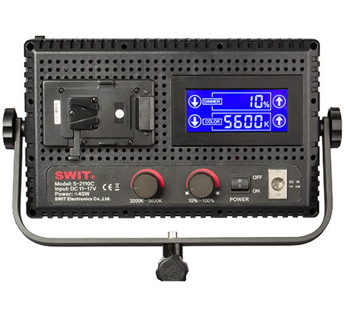 An intuitive LCD touch screen allows quick and precise control of color temperature and dimming levels. For flexible operation, the S-2110CS can be powered by a V-mount battery for mobile use or an AC-DC adapter for studio setups. The integrated U-shape support bracket and standard lighting tripod mount ensure easy positioning and secure installation.