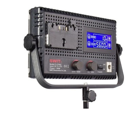 The SWIT S-2110CS (LUX) is a portable 40W bi-color LED panel light featuring 576 ultra-bright LEDs, adjustable 3200K–5600K color temperature, and up to 1600 lux at 1 meter. With V-mount/Gold mount battery or AC adaptor power options, LCD touch control, and included carry case, it is ideal for studio and field production.