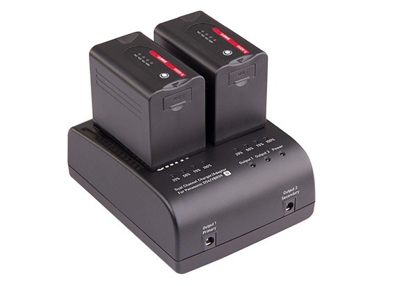 The SWIT S-3602D is a dual charger for SWIT S-8D98, S-8D58, and S-8D62 batteries, also compatible with Panasonic VW-VBD58, AG-VBR59, and CGA series (D54, D28) DV batteries.