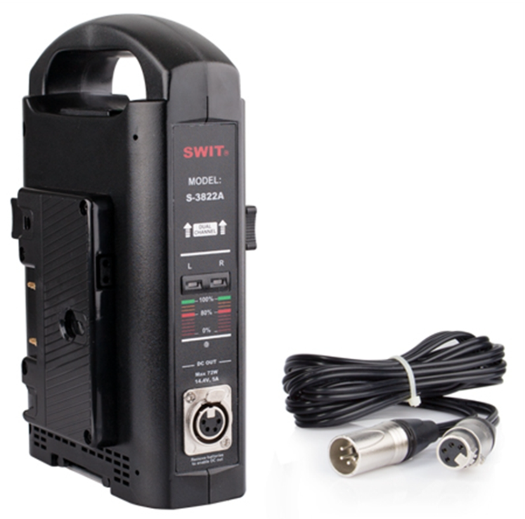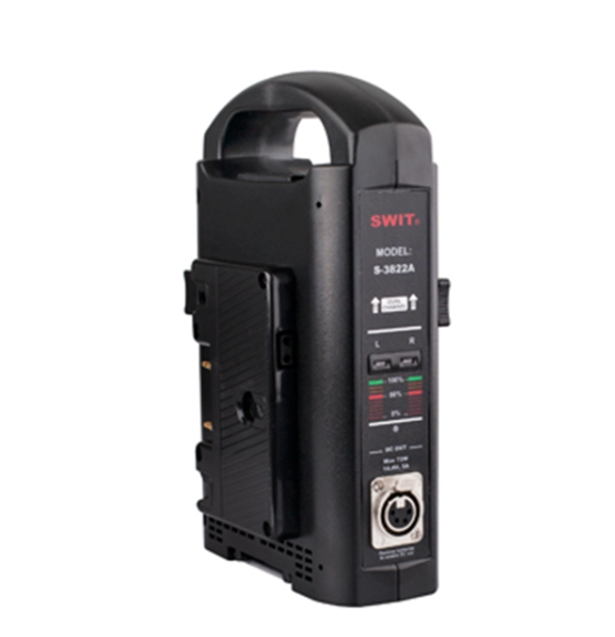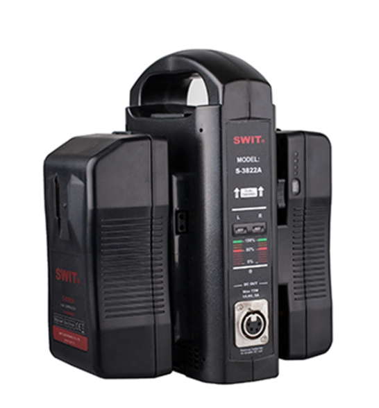 The SWIT S-4030 is a 4-battery V-mount power station that provides dual 24V outputs