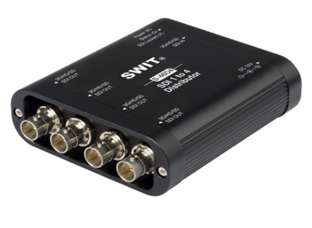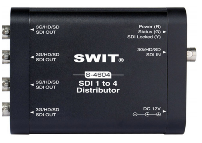 The SWIT S-4604 is a compact and heavy-duty 3G/HD/SD-SDI 1-to-4 distribution amplifier, designed to split a single SDI input into four re-clocked SDI outputs. Built with a robust aluminum casing and status indicators, it is ideal for broadcast and professional video production environments.