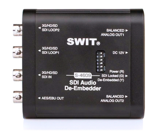 The S-4609 SDI Audio De-Embedder is a portable mini converter that extracts up to two channels of audio from 3Gb/s SDI signals, offering AES/EBU and balanced 6.35mm audio outputs for professional broadcast and field production use.