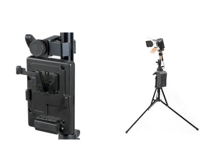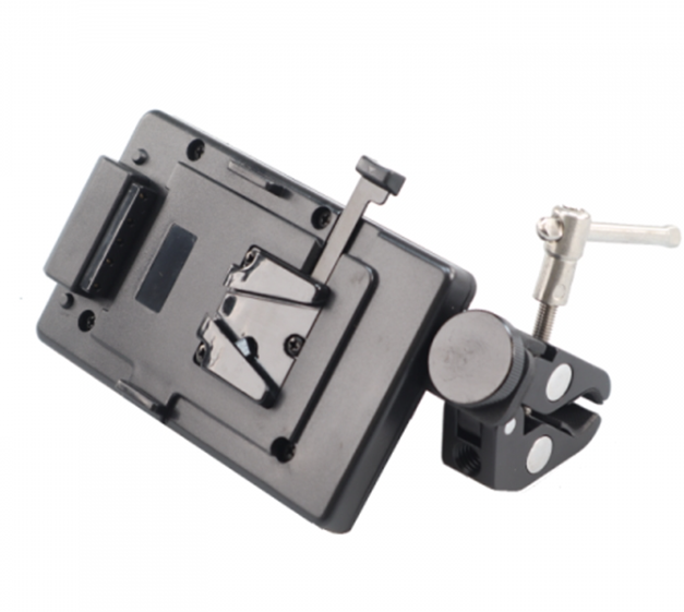 The plate supports standard V-mount batteries and features a D-tap (P-tap) DC output, delivering the battery’s native voltage to power LED lights, monitors, wireless transmitters, or other professional accessories. The robust clamp design ensures stable attachment to stands and tripods, making it ideal for lighting setups, mobile rigs, and ENG workflows.