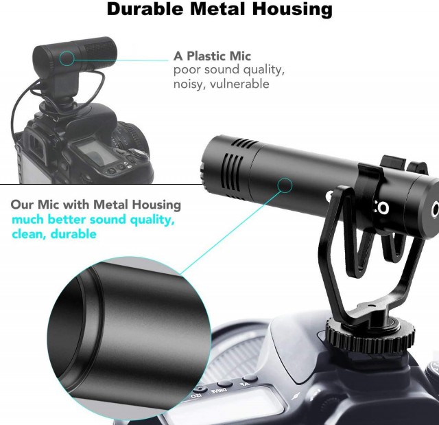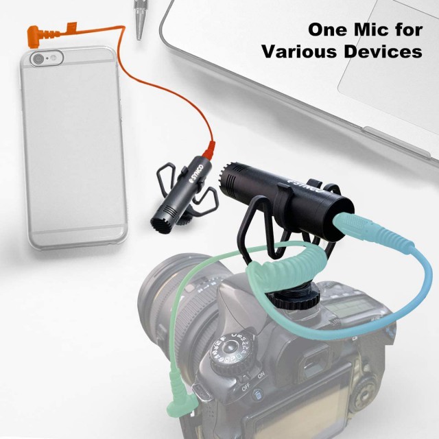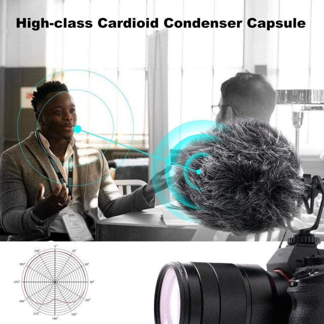 On-Camera Microphone: Mini, light but professional, it is an on-camera microphone adopting cardioid electret condenser and mic suspension design with better sound pick-up effect.