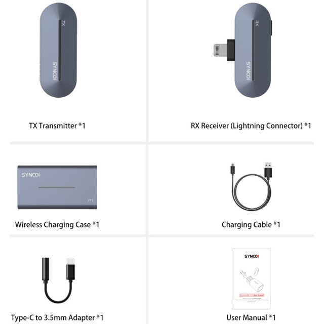 The SYNCO P1 is a line of recording microphone for iPhone® and Android phone. The P1T (with Type C connector) connects to Android smartphones, and the P1L (with Lightning connector) designed for iPhone® or iPad®.