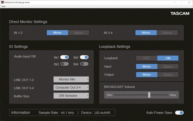 The US-1x2HR is the smallest member of the Tascam US-HR series of high-resolution USB audio interfaces. It has one mic and one instrument input and is therefore particularly suitable for simple and intuitive guitar/vocal recording with a computer. The included loopback function and support for Open Broadcaster Software (OBS Studio), however, makes it also an excellent choice for podcast creation and live streaming. Last but not least, it is a perfect solution for feeding an amplifier system with music from a computer in high quality, for example for a birthday party.
