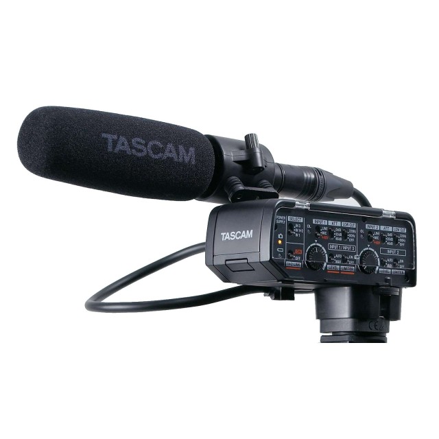 Don’t worry if your camera’s hot shoe cannot handle a digital audio signal nor power the Tascam mic adapter. The CA-XLR2d-AN analogue kit can be used with virtually any camera that has an analogue audio input. Attach the included battery box (two AA batteries) and connect the analogue output of the CA-XLR2d to the microphone input of the camera with the included stereo audio cable. This allows you to benefit from the high-quality microphone preamplifiers and audio processing functions and significantly improve the sound of your film recordings.