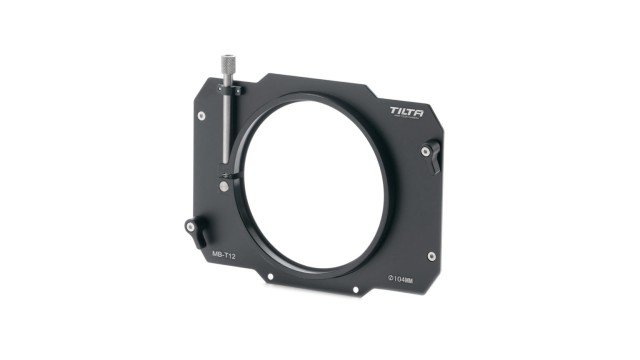 The Tilta MB-T12-104 Clamp-On Adapter allows the MB-T12 4×5.65" matte box to securely mount onto lenses with a 104mm outer barrel, featuring a sturdy thumbscrew-tightened clamp and durable aluminum construction.