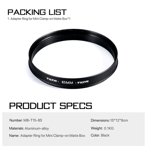 The Tilta MB-T15-85 is a lightweight black aluminum adapter ring that screws onto any lens with an 85 mm front filter thread, enabling secure clamp-on attachment of the Tilta Mini Clamp-On Matte Box (MB-T15) while retaining a usable 85 mm filter thread on the front – perfect for stacking screw-in NDs, CPLs or effects filters before mounting the matte box on compact cinema or mirrorless lenses.
