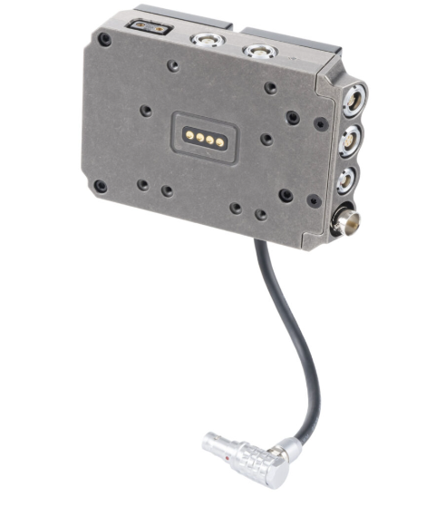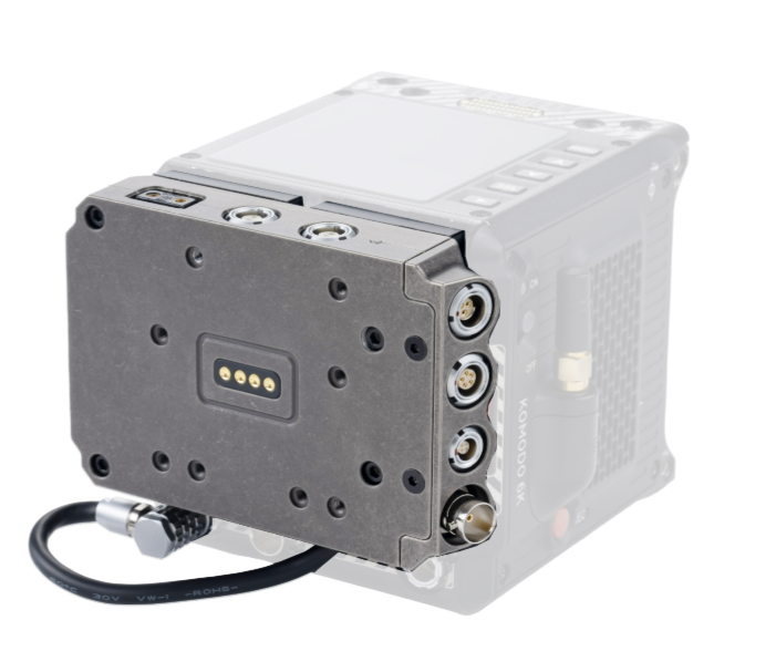 For batteries capable of discharging below 12V, the module will shut off power early—but the difference in runtime is minimal and helps preserve long-term battery health. The module also includes an integrated KOMODO EXT cable that plugs directly into the camera’s EXT port, unlocking expanded functionality such as Run/Stop, Timecode, and Genlock through dedicated ports. Its 3-Pin Fischer R/S port allows simultaneous Run/Stop triggering and power delivery to accessories such as the Tilta Nucleus-M via an optional Fischer R/S cable.