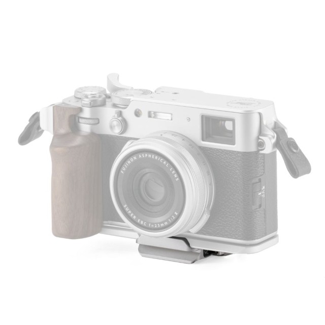 This ARCA quick release plate attaches directly to the bottom of the wooden grip mounting base for the Fujifilm X100VI.