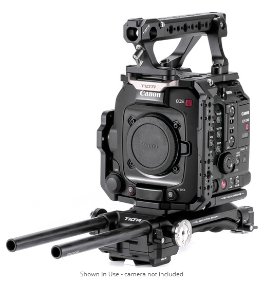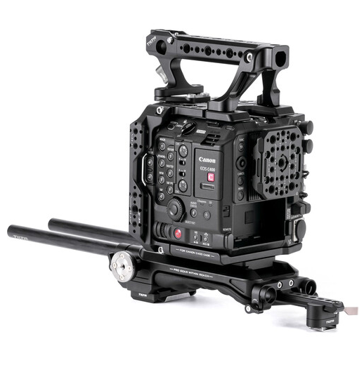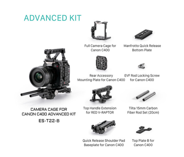 The Tilta ES-T22-B Camera Cage for Canon C400 (Advanced Kit) delivers a complete modular ecosystem designed to enhance stability, expand mounting options and streamline transitions between tripod, shoulder, and handheld shooting. The cage includes top, left, and right side plates, a Manfrotto-type quick release bottom plate, a top handle, 7.8" 15mm rods, a multifunctional back plate and an additional Top Plate B for more accessory compatibility. Its included EVF rod locking screw ensures full compatibility with the Canon C400’s electronic viewfinder.