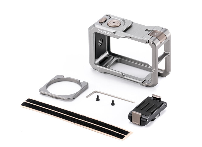 The Tilta TA-T72-A-TG Full Camera Cage with Mounting Baseplate Kit (Titanium Gray) is a complete, shoot-ready modular rig for the DJI Osmo Action 5 Pro/4/3, combining a protective magnesium-aluminum cage with dual-side quick-release, magnetic Tilta filter support, top cold shoe, side 1/4"-20 thread and a magnetic quick-release baseplate that can be attached to the bottom or side – all finished in sleek Titanium Gray for ultimate durability and style.