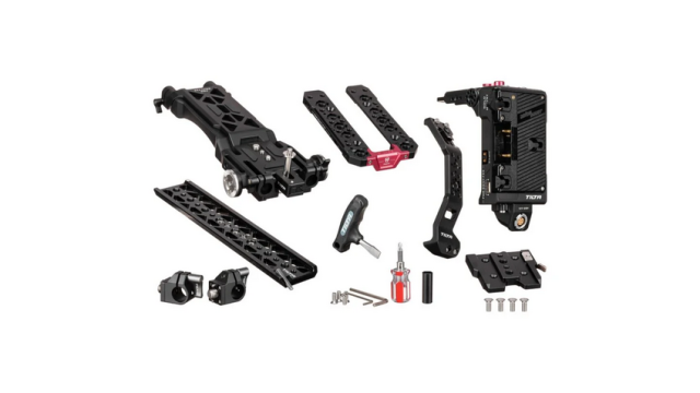 The Tilta Camera Cage for Sony FX9 - V-Mount V2 is crafted to enhance the Sony PXW-FX9's performance and versatility. Designed with precision, the cage snugly fits around the camera’s top handle, incorporating 15mm LWS rod adapters to mount the camera’s viewfinder easily. The V-mount battery plate attaches directly to the back of the cage, providing various power outputs to keep your accessories ready for action. Additionally, the adjustable baseplate offers seamless compatibility with VCT-U14 plates for rapid switching to shoulder-mounted operation and features an ergonomic shoulder pad for comfort.