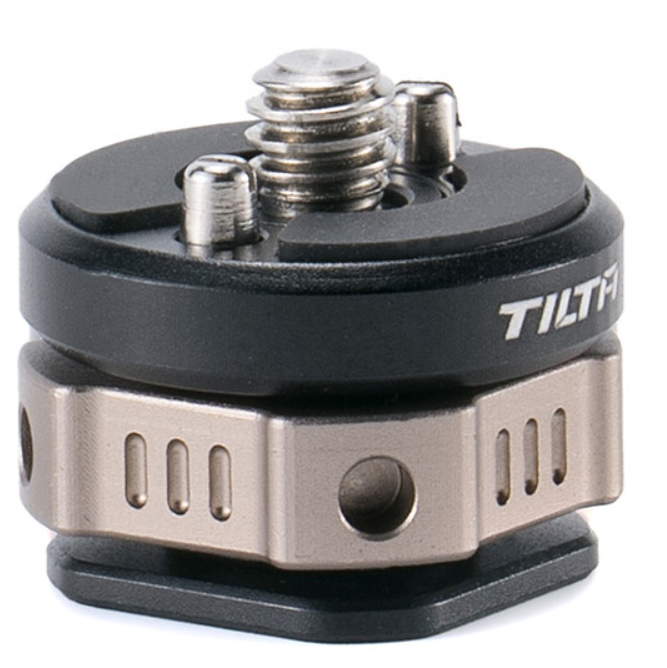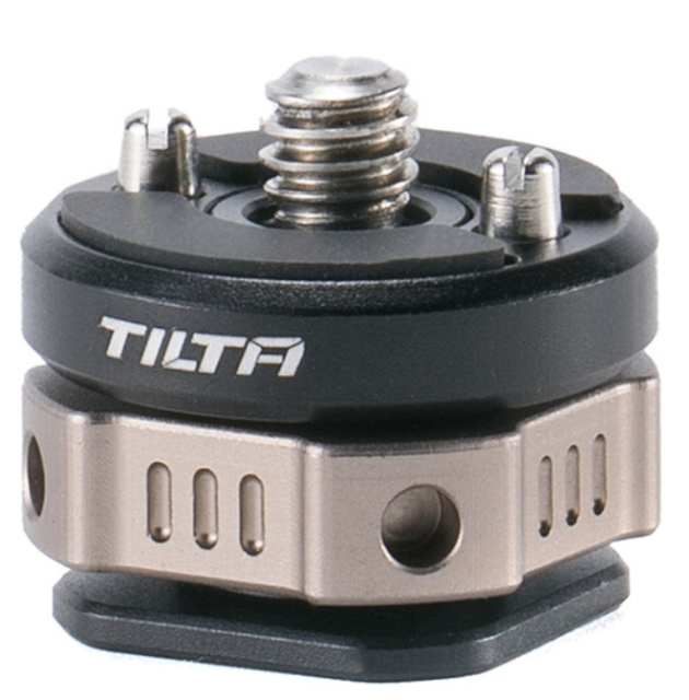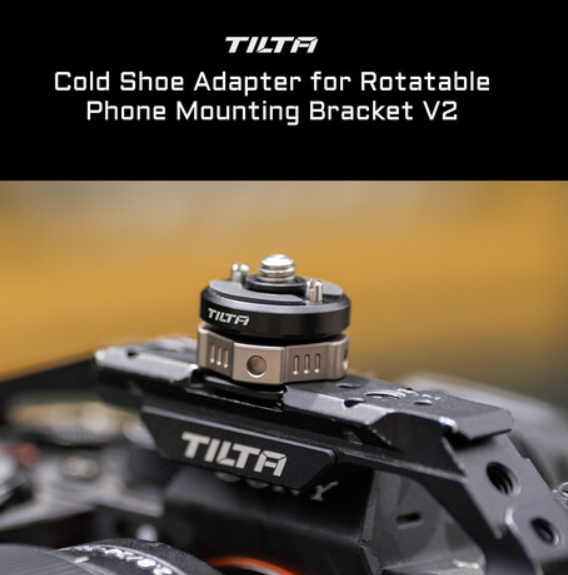The Tilta TA-PMB5-CS-B Cold Shoe Adapter is a compact, rock-solid aluminum connector that instantly converts the bottom 1/4"-20 thread of the Tilta Rotatable Phone Mounting Bracket V2 into a standard cold shoe foot, allowing the phone holder to be quickly attached to any camera hot shoe, cage cold shoe or accessory shoe without tools.