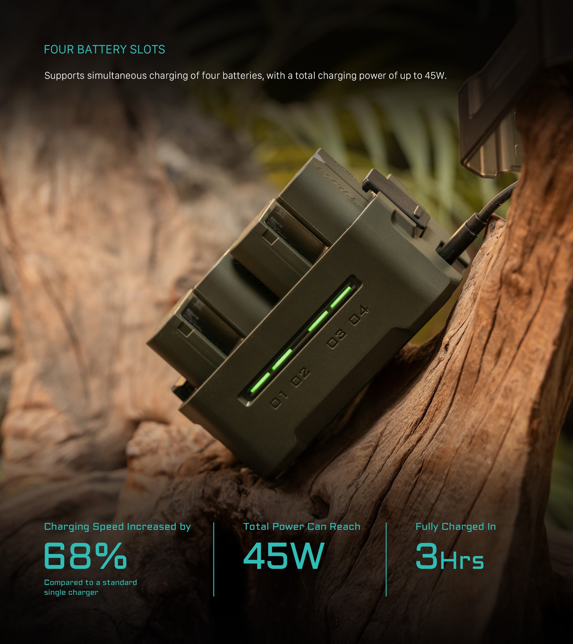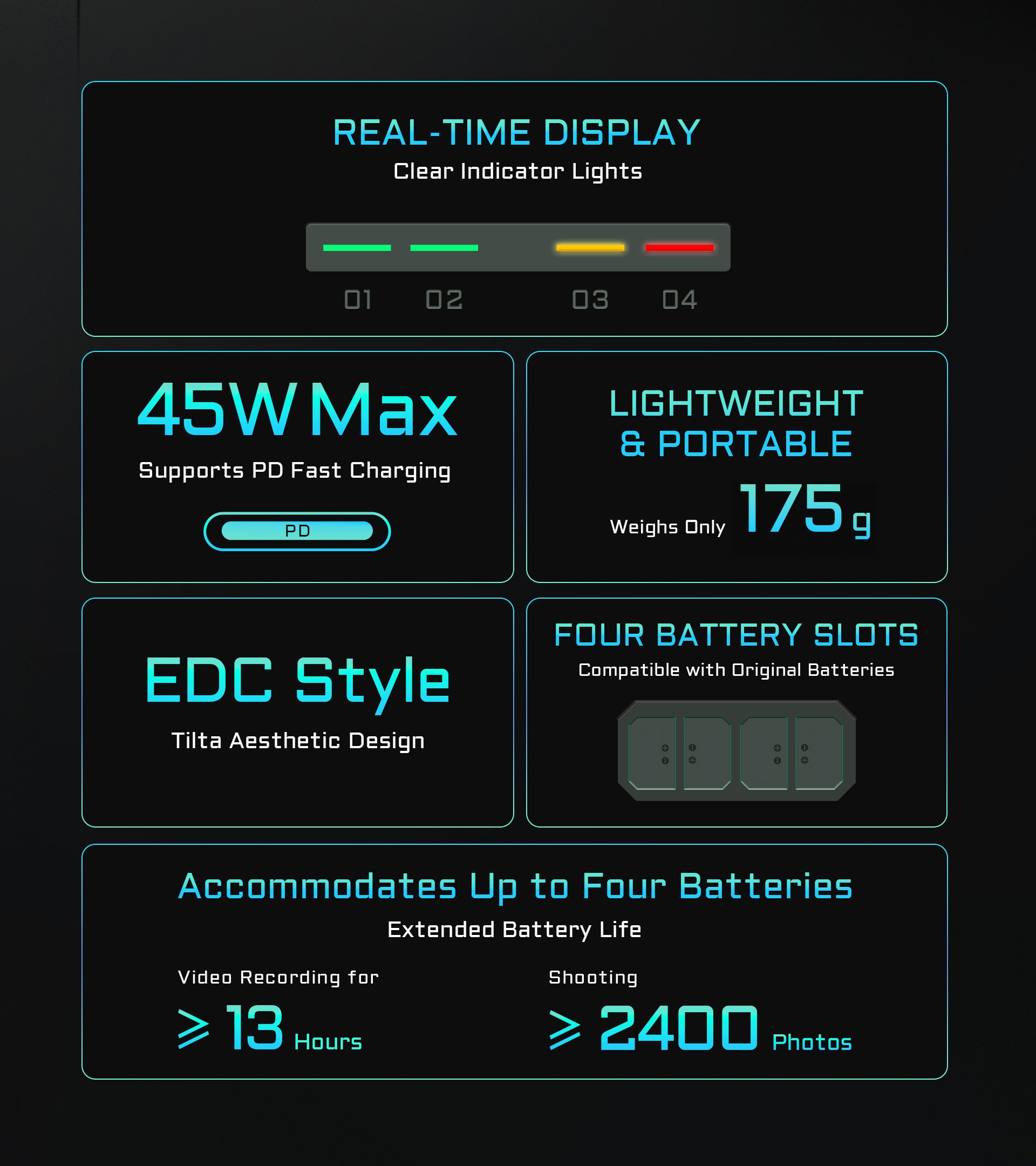 • FOUR SLOTS Allow Users to Charge Four Batteries Simultaneously